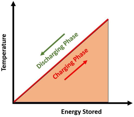 Sensible heat storage is a highly cost-effective method for storing thermal energy. It includes storing heat energy inside the material’s sensible heat capacity, as its temperature changes, as shown in Figure 3. SHS is a TES subcategory that elevates material temperature without phase change to store heat [20]. This versatile and commonly used TES technology finds applications in space cooling and heating, and domestic hot water as well as industrial settings. SHS systems capture heat by temperature increment of storage media such as metals, rocks, concrete, water or molten salts. The quantity of heat captured through SHS is linked to the material’s weight and its temperature rise [21]. SHS systems offer a combination of simplicity and affordability, making them a popular choice. SHS systems boast high efficiency levels, typically recovering between 70% and 90% of stored energy [22]. While SHS systems excel in efficiency, they typically store less heat per unit volume compared to other TES technologies like LHS. SHS systems can be primarily categorized into liquid-based and solid-based depending on their storage medium.
