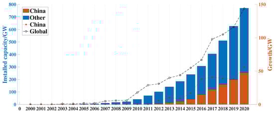 As a virtually inexhaustible clean energy, solar photovoltaic (PV) power plays an important role in the world’s energy field. Over the past decade, the global deployed on-grid PV capacity has grown by an astonishing 1860%, from 41.5 GW in 2010 to 773.2 GW in 2020 [1]. Furthermore, the global deployed on-grid PV annual new installed capacity is also increasing year by year. As shown in Figure 1, whether in terms of annual growth or overall growth trend, PV power generation has a promising development prospect.