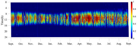 The low predictability of PV power generation is mainly due to the instability and discontinuity of power generation components affected by extremely unpredictable weather conditions. Figure 2 depicts the diurnal variation of PV power output under different weather conditions at Shaoxing Station. It can be seen that the PV power output is quite different under different weather conditions. On sunny days, the power curve presents a full bell-shaped curve. On rainy days, the output of power is at a low value, while on cloudy days it is in between. From the perspective of the time dimension, PV daily power generation is highly positively correlated with sunshine length. Figure 3 depicts the variation in sunshine duration with seasons and the variation in daily radiation values. It can be observed that there is a variation trend from the shortest sunshine duration in winter to the longest sunshine duration in summer. From the perspective of spatial dimension, places that are close to each other have a similar weather distribution. However, due to the instability and discontinuity of weather, daily power generation often has great differences. For example, the weather in Shaoxing and Jiaxing is completely different, although their annual weather distribution is similar. The weather uncertainty in time and space causes the instability and discontinuity of PV power generation, so the error of PV power prediction is relatively high.