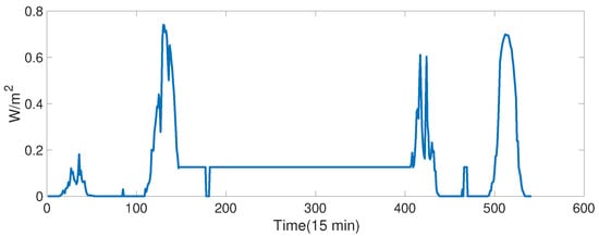 As shown in Table 1, the data from Shaoxing station contain many external features, i.e., (1) cant radiation, (2) direct normal irradiance, (3) diffuse solar radiation, (4) total radiation, (5) atmospheric pressure, (6) relative humidity, (7) ambient temperature, (8) the panel temperature, (9) wind speed, (10) wind direction, and (11) precipitation. The proportion of features strongly correlated with the output power is very small, and most features have little correlation with the output power. Therefore, these redundant features will have a great impact on the prediction accuracy, and how to find the appropriate feature similarity metric is particularly important. In addition, due to the constraints of realistic conditions, data acquisition and data transmission anomalies often occur in sensor sampling, as shown in Figure 4 (the data collection interval is 15 min), which often leads to difficulties in improving the accuracy of data-based prediction methods. Therefore, a suitable data repair mechanism is required to integrate the original data. In this paper, we have built a data augmentation module to overcome this difficulty.