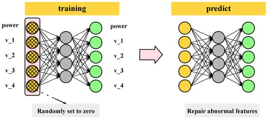 The abnormal data, , are selected, and the remaining data, (where ), are put into the autoencoder for training. The input vector is randomly set to zero for anti-noise training, and the specific formula is as follows: