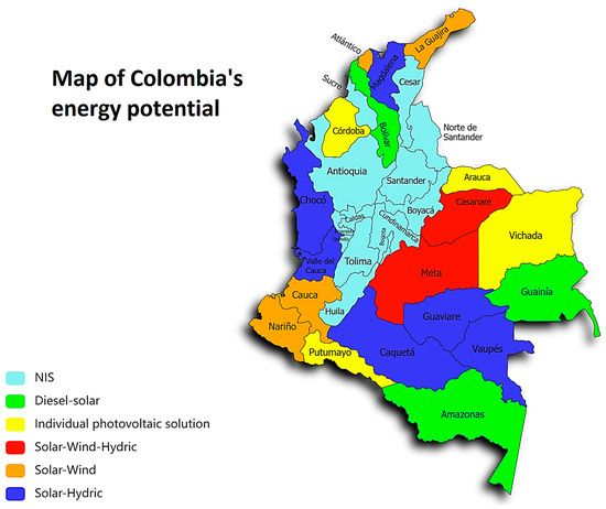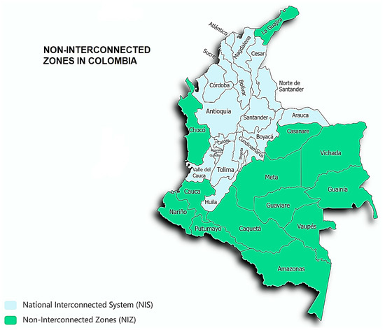 The national government’s goal is to provide electricity service to all Colombians. The national government has created the Indicative Expansion and Coverage Plan (IECP 2019–2023), which identifies the areas that do not have access to this service and proposes appropriate solutions to their conditions; these areas are called NIZs. On the other hand, there is the National Energy Plan (NEP 2054), which proposes a route for the country’s energy development in a sustainable and efficient way, responding to the challenges of climate change [1,2,8].
