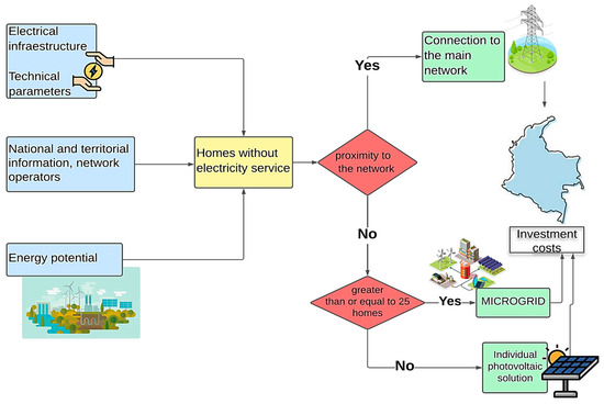 According to Decree 1523 of 2015, the main objectives of the IECP are to identify the needs of the electric power service and quantify the investments required to achieve its universalization. To do this, the IECP proposes three solutions: if the area is close, a connection with the NIS (National Interconnected System) is proposed and an extension of the network up to 1.5 km to the isolated area; if the area is far away or difficult to access, off-grid solutions (off-grid) consisting of an individual solution of solar panels is proposed; or where large communities exist, the MG solution is proposed. These objectives and the different alternatives presented in a diagram are illustrated in Figure 3 [9].