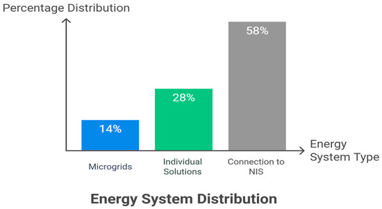 Disconnected or isolated solutions, also known as off-grid solutions, refer to electric microgrids (MGs) and individual solar panel systems, as mentioned in Figure 3, For communities in non-interconnected zones (NIZs), the use of MGs is justified in clusters of at least 25 dwellings within a radius of 1.5 km, with a potential demand for unit electricity exceeding the minimum residential consumption of individual solar panel systems. In addition, these groups must have users such as shops, small workshops, schools, health posts, police stations, a water pumping system for the population, and other institutions and/or businesses. As MGs are designed to supply electricity through a low-voltage and alternating-current network, new technologies can in the future interconnect medium-voltage networks [1,10].
