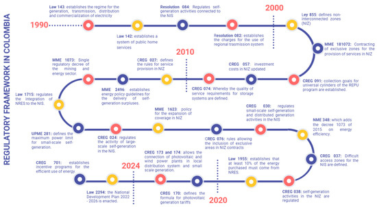 Timeline, legal, and regulatory framework in Colombia (own elaboration) [11,12,13,14,15,16,17,18,19,20,21,22,23,24,25,26,27,28,29,30,31,32,33,34,35,36,37].