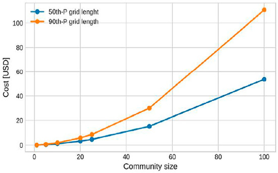 - Another important aspect that arises from the study [46], and that is of interest to raise MGs in NIZs, is the distance between households. Figure 8 shows a comparison between the investment cost and the distance between users compared with the size of the communities, showing us two cases; the 50th percentile is a distance of 7.92 m and the 90th percentile corresponds to 13.51 m. The result shows that investment costs increase when there is a greater distance between one user and another, in addition to the fact that this result is directly proportional to the size of the community, so that costs increase even more as there are more users.