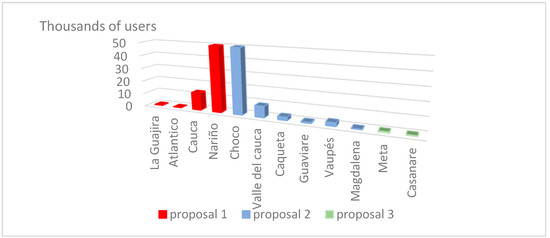 Based on the data on inhabitants provided by the single information system until 2020, Figure 10 shows the number of users in NIZs who benefited by each of the three proposals based on the combination of the most efficient renewable energy sources in that area. The graph shows which departments benefit the most, being the departments of Nariño and Choco [7].