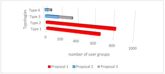 If we look at the number of users grouped by typologies shown in Figure 11, we can make another comparison between the three proposals and how they give a solution to each of the typologies.