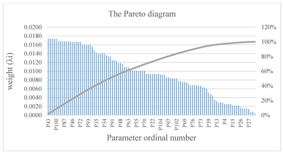 When producing oil from an offshore production platform, a list of parameters can be identified that have an effect to a greater or lesser extent. Within the framework of this research work, 104 parameters were identified. After applying the expert assessment method, a Pareto diagram was obtained, grouping factors by the importance of their influence on the system. Based on the data obtained and the Pareto diagram (Figure 1), the significant factors are those that have weight λ ≥ 0.0102.