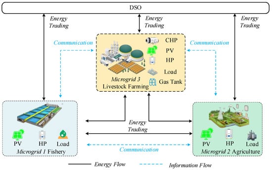 The rural multi-regional IESs structure is illustrated in Figure 1. The system primarily comprises fisheries, agriculture, and livestock farming with each agricultural region functioning as a microgrid capable of independent operation through interactions with the upper-level distribution grid. Each microgrid mainly consists of energy supply equipment, energy conversion equipment, and energy storage equipment.