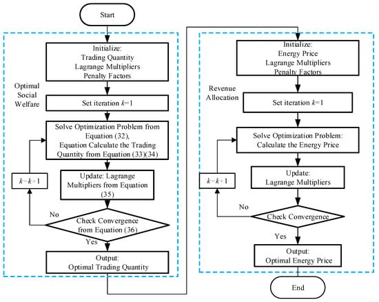 where is the convergence tolerance of the algorithm. If Equation (36) is satisfied, the iteration stops. Otherwise, return to step (2) and enter the next iteration until the convergence condition is met or the maximum iteration count is reached. The detailed procedure of the algorithm is shown as follows. The revenue distribution subproblem can also be solved by ADMM distributedly. The steps are as above in the Figure 2 and will not be repeated here.