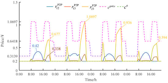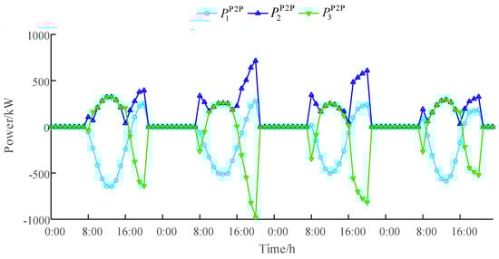 The energy interaction results between the microgrids are shown in Figure 3. From 10:00 to 17:00 each day, the load of Microgrid 1 is small, and after meeting its own load, the photovoltaic generation still has surplus. During this time, the transaction electricity prices between Microgrid 1 and Microgrids 2 and 3 are higher than the selling price to the upper-level grid but lower than the purchasing price from the upper-level grid. Therefore, Microgrid 1 transmits energy to Microgrids 2 and 3, which not only increases its own revenue but also reduces the purchasing cost for Microgrids 2 and 3. From 17:00 to 22:00, the purchasing price peaks, and photovoltaic generation is unavailable. Microgrid 3 generates electricity by burning biogas from its storage tank, with the excess energy being transmitted to Microgrids 1 and 2, which cannot generate electricity at night. During this time, the transaction prices between the three microgrids are all between the purchasing and selling prices of the upper-level grid. Therefore, Microgrid 3 significantly reduces its operational cost by selling electricity to other microgrids, while Microgrids 1 and 2 can also reduce their purchasing costs.