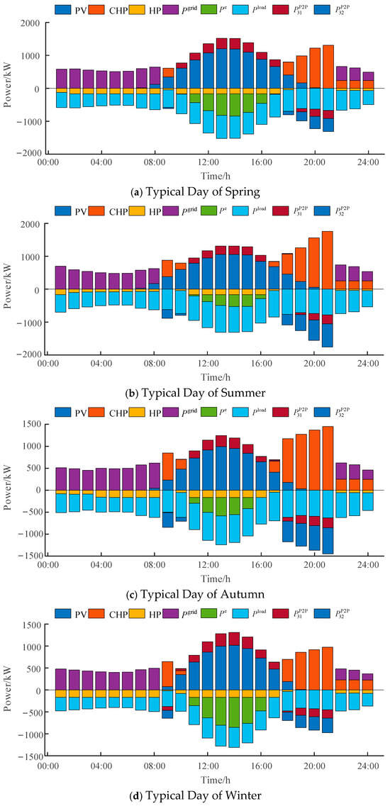 In this paper, we take a real farm enterprise, which is configured with only photovoltaic and biomass clean energy sources, and consider the problem of sharing and interacting electrical energy among three micro-integrated energy systems (IESs). A farm IES is constructed, consisting of three microgrids (Microgrid 1 for fisheries, Microgrid 2 for crop cultivation, and Microgrid 3 for livestock farming). Four typical days in spring, summer, autumn, and winter are selected for the analysis. The load profiles for typical days in different seasons for the three microgrids are shown in Appendix A. Simulations are conducted on an Intel I7-9700K CPU with 16 GB of memory. The simulation program is developed in MATLAB R2023b and solved using the Gurobi 11.0.1 solver. The value of is 0.01.