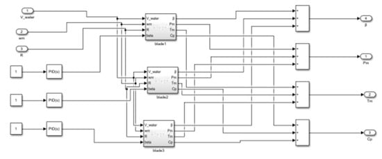 The research and public literature regarding active pitch control technology in tidal stream generator sets is scarce. The independent variable pitch load control strategy based on fuzzy PID parameter self-tuning was studied by Lin Yonggang’s team from Zhejiang University for the 120 kW horizontal-axis ocean-current generator set, aiming to reduce the asymmetric load caused by ocean current turbulence and shear action in the impeller plane. Through the establishment of the blade rotation coordinate system and the impeller fixed coordinate system, the blade force was converted to pitch moment and yaw moment and the blade root bending moment was transformed to the d-q coordinate system. However, the Coleman transformation and its inverse require significant calculations. For real-time control systems, this can increase the computational load, particularly during high-frequency load changes, potentially causing response delays. Controlling the root bending moment by the adaptive gain method under the flow velocity shear of the tidal power generator set has been investigated in the literature [