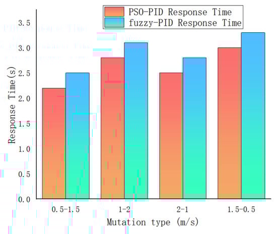 Taking the uniform flow rate 1 m/s as an example, we assumed that the mean response time of the PSO-PID algorithm was , the standard deviation was , and the sample size was . The mean response time of the fuzzy PID algorithm was , the standard deviation was , and the sample size was .