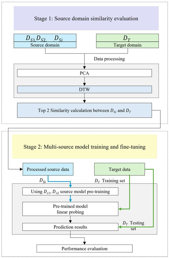 The first step of the proposed framework involves selecting suitable source data for transfer learning by evaluating the similarity between the source and target domains. This ensures that the pre-training is based on data with high relevance to the target domain. In particular, this study utilizes principal component analysis (PCA) and DTW to evaluate the similarity quantitatively and select the most appropriate source data to improve the data selection accuracy in the initial stage. This design provides a foundation for efficient identification and utilization of suitable sources, even in environments with diverse source data. The second step involves utilizing the selected source data to pre-train a multi-source model and fine-tune it for the target domain. The multi-source model is designed to learn generalized characteristics by integrating individual source data. Subsequently, by performing linear probing on the target domain data, a parameter fixation technique is utilized to preserve the generalized knowledge learned from the source domain while gaining target domain-specific adaptability to achieve optimal prediction performance on the target data.