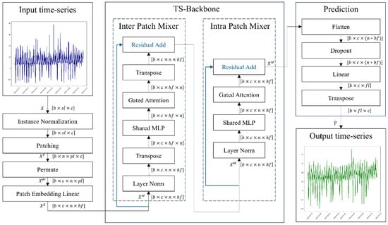 The first step, instance normalization, leverages the Reversible Instance Normalization (RevIN) model to normalize the distribution of the input data to increase the learning stability by normalizing each instance, which helps the model to learn without being significantly affected by deviations in the data [52]. First, the input data X are provided in the form [], where b is the batch size, is the time series length, and c is the number of channels. The input data are then normalized using instance normalization. This process removes the mean and standard deviation of the data to account for the variations in their distribution. Subsequently, the input data are divided into patches, which are converted into the form [], where n is the number of patches and is the length of the patches. The data are then converted into [] by permutation, which restructures the dimensions of the patches and channels and prepares them for processing in the backbone.