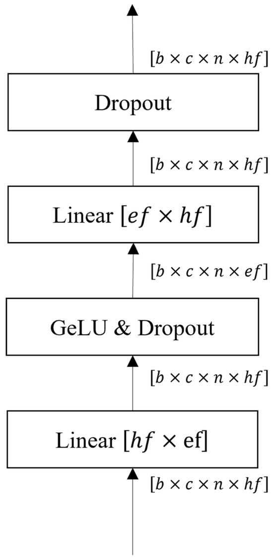 First, the input data of size pass through the first linear layer, where the feature dimension is converted into . This transformation maps the data to a new feature space to enable more effective feature learning. The output size of the transformed data is . Next, a Gaussian error linear unit (GeLU) activation function is applied to add nonlinearity to the data [53]. This allows us to learn more complex patterns beyond simple linear relationships. Simultaneously, a dropout is applied to prevent overfitting by randomly disabling some features during training. At this stage, the data size is maintained at . After passing through GeLU and dropout, the data are passed to the second linear layer, where the dimensionality is restored from to . This ensures that the dimensions of the input and output data are consistent and compatible with those of the other layers in the model. The size of the output data at this stage is restored to . Finally, an additional dropout layer is applied. This step serves as an additional normalization process to improve the generalization performance of the model further and prevent overfitting. The size of the final output data is maintained at . The MLP block consists of two linear layers, a GeLU activation function, and dropout. This block performs feature transformation and generates a learnable representation while maintaining dimensionality consistency between the input and output.