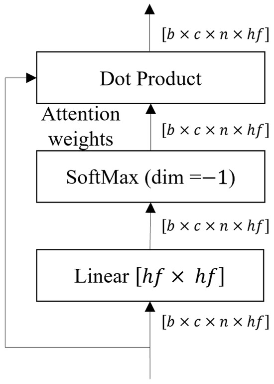 where A is a function that computes the attention score for input , and is the input tensor from the previous mixer component. The Softmax function is computed to represent the importance of certain features probabilistically, increasing the weight of more important features and decreasing the weight of less important features.