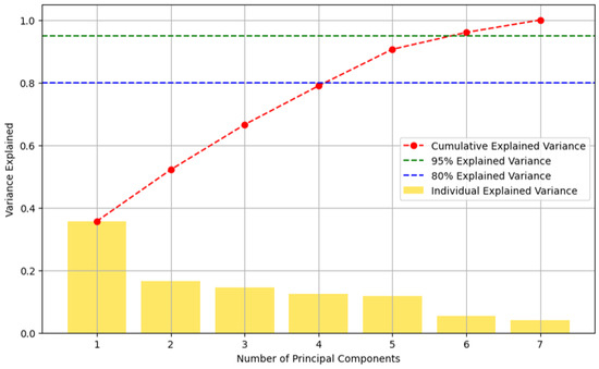 The process of applying PCA was performed in two steps. In the first step, all data were merged to select the optimal number of principal components that reflected the main flow and variance of the data. Figure 5 shows the cumulative explained variance as a function of the number of principal components, which led to the conclusion that six principal components were required to explain more than 95% of the variance in the data. This result was used as a guide to determine the number of principal components to be used when applying PCA to each source and target domain data point separately.