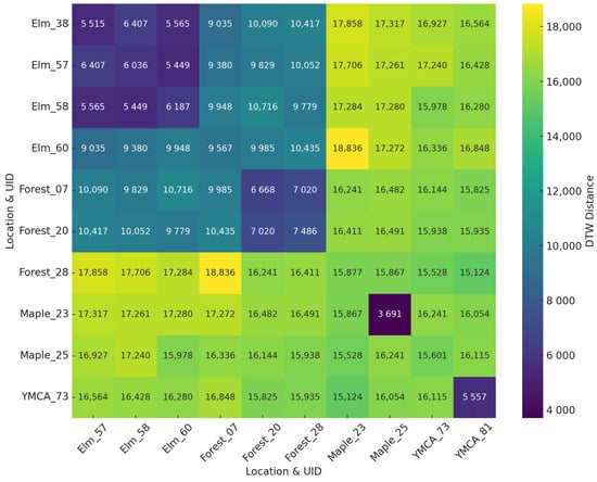 DTW calculates the distance between each point in the two time-series data points in the form of a matrix and then determines the path that most closely matches the two time series [34]. The optimal path does not compare all time intervals equally, but instead, allows for temporal distortions and responds nonlinearly to maximize the pattern similarity [35]. As DTW allows for temporal nonlinearity, it can accurately measure similarity even in data with the same pattern that change along the time axis. This is particularly useful for weather-sensitive data such as solar power generation. Solar power generation shows similar patterns at different times owing to weather changes or sunlight differences. For example, cloud cover may occur at different times of the day or sunlight may fluctuate from hour to hour; however, the overall pattern of power generation may be similar. DTW adjusts for this variability temporally to enable pattern comparisons [36]. DTW also offers the ability to compare data at different time scales. This provides us with the flexibility to analyze long-term patterns, as opposed to models that focus only on specific time periods.