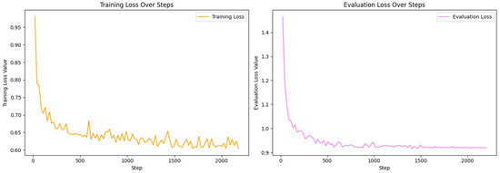 In terms of learning loss, the loss value in the initial stage started at 0.9803 and converged to 0.6096 after about 2000 steps, which is a total loss reduction of 0.3707, indicating that the model converged stably as it gradually learned the data patterns. The loss value at the beginning of the validation started at 1.4657 and converged to 0.9199 after about 2000 steps. The total loss reduction was 0.5458, showing that the model successfully learned from the validation data while maintaining its generalization performance. In addition, the learning time tended to decrease gradually with each training step, indicating that the model learning process became increasingly efficient. The detailed loss and time values for each step are shown in Table 4.