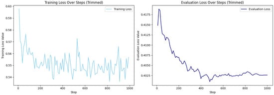 The x-axis represents the number of steps required for training. By using the step unit, we can observe the detailed changes in the loss value during training and consistently represent the training progress regardless of the batch size. In this study, the loss values were recorded for each batch processing to visualize the rapid loss reduction at the beginning of training and the stable convergence process at the end of training. The y-axis represents the loss measured at this step. The loss value is a measure of the difference between the predicted result of the model and the actual value and is calculated using the MSE; the lower the loss value, the closer the model prediction to the actual value.