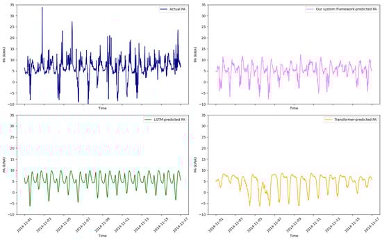 Figure 9 compares the predicted values of the model with the actual values along the time axis. The x-axis of the graph visualizes values over the time range from 1 November 2014 to 17 November 2014. The y-axis represents the values of PA, with the blue line representing the actual values and the green line representing the model predicted values. This visualization was used to compare the predictive performance of the model along the time axis. Overall, the model predictions showed a high degree of similarity to the actual values and accurately reflected the trends in the data over time.