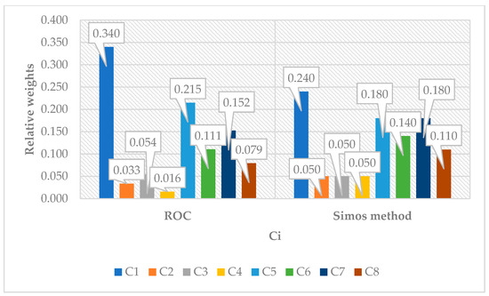 Relevant weights of the evaluation criteria corresponding to the ROC and Simos methods.