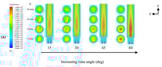 Figure 11 illustrates the effects of changing the vane angle which is indicative of swirl strength, on the distribution of temperature and OH mass fraction within the combustor. The information is given by contour plots and profile plots along the centerline. Figure 11a,b demonstrate that the regions of high temperature and high OH mass fraction are predominantly localized along the axial centerline, and increasing the vane angle leads to a reduction in the length of these distributions (high temperature and high OH mass fraction zones). Furthermore, it is noted that the width of high temperature region extends and the concentration of the high OH mass fraction region is also seen to shorten longitudinally and move closer to the burner exit plane with larger vane angles. This indicates the presence of shorter flames.