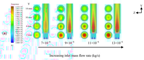 Figure 14 illustrates the impact of increasing the inlet mass flow rates on the temperature and OH mass fraction profiles, shown through contour plots and along the combustor’s central axis. As seen in Figure 14a, growth in the spatial extent of high-temperature areas, both wider and taller, accompanies heightened mass flow rates. This effect is fundamentally due to the heightened heat generation when mass and fuel flow rates increase while maintaining an equivalence ratio of 1. Notably, the total nominal heat input rises from approximately 20.5 W to around 38 W as flow rates increase from 7 × 10−6 kg/s to 13 × 10−6 kg/s. Furthermore, the high-temperature zone of the flame is characterized by a flat leading edge, which then evolves into a sharply pointed end in the trailing edge in the burner axis.