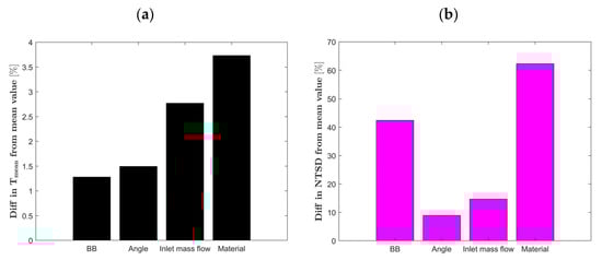 When assessing the thermal performance of a micro-combustor (bluff-body and swirl-stabilized micro-combustor in our research), three crucial parameters come into play: the mean outer wall temperature (), the radiation efficiency (), and normalized temperature standard deviation (NTSD), which is an indication of the uniformity of outer wall temperature [4,62]:
