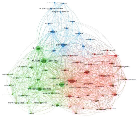 Based on the statistics of the searched keywords, after merging similar keywords and removing irrelevant ones, 7801 keywords were retrieved, with 67 keywords appearing more than 50 times. The most frequently occurring keyword was “mechanical-properties”, appearing 641 times, followed by “recycling” with 579 occurrences, and “composites” with 467 occurrences. Additionally, “pyrolysis” appeared 169 times. The results indicate that the research hotspots in the field of decommissioned wind turbine blades focus on the performance of fibers after recycling and the study of recycling technologies. Using the VOS viewer software, keyword clustering was performed to generate a keyword co-occurrence cluster view (as shown in Figure 4), identifying the research hotspots in recent years. In Figure 4, the keyword clustering consists of three clusters. The red cluster (centered around “recycling”) includes keywords such as “waste”, “technologies”, “reuse”, “recovery”, and “pyrolysis”, indicating that this cluster focuses on recycling technologies and process optimization for composite materials. The green cluster (centered around “mechanical-properties”) focuses on material performance research, including keywords such as “fiber”, “natural fibers”, “polymer composites”, and “thermal properties”. This indicates that the field emphasizes the mechanical properties of composites (e.g., tensile strength, thermal properties), as well as the application of fiber reinforcement and natural fibers. It also involves “degradation” and “morphology”, reflecting a focus on material aging and degradation processes. The blue cluster (centered around “performance”) includes keywords such as “strength”, “durability”, “recycled aggregate concrete”, and “compressive behavior”, indicating that this cluster focuses on the application of composites in construction engineering, especially in the use of concrete and structural materials. The core keywords “recycling”, “mechanical-properties”, and “performance” have larger nodes, indicating that these themes are the main research lines in the literature. The higher frequencies of “waste”, “technologies”, and “fiber” suggest that waste treatment technologies and fiber-reinforced composites are key sub-directions of focus. The close association between “recycling” and “composite” indicates that the mechanical properties of composite materials are crucial for the development of recycling technologies. Additionally, the terms “pyrolysis”, “recovery”, and “circular economy” in the red cluster suggest that pyrolysis and other recycling technologies are important research directions for the recycling of composite materials such as wind turbine blades.