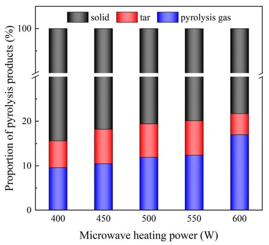 The recovery of pyrolysis oil and gas varies under different microwave power levels. Zhang et al. [82] reported the recovery of pyrolysis oil and gas under different power levels, as shown in Figure 11. As the microwave heating power increased, the pyrolysis gas yield increased monotonically, while the tar yield initially increased and then decreased.