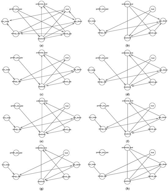 This paper aligns with a second body of research that examines the influence of energy consumption on income inequality. Sonora [16], using panel data from 144 countries spanning 1990–2018, reported a negative relationship between energy consumption and income inequality. This negative association was also observed in sub-sample analyses across four economic groups (OECD, non-OECD, OPEC, and former/current communist economies) and five regions (Asia, Eastern Europe, Western Europe, Latin America, and Asia). Other studies have investigated causal links between these variables. Galvin [28], for instance, identified a significant causal relationship from electricity consumption to income inequality in middle-income countries. Distinct from these prior works, our study employs Bayesian networks to explore causal relationships, complementing traditional panel data causality analysis.
