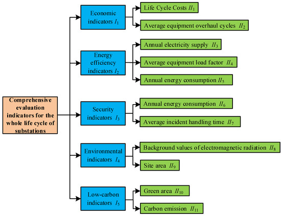 On the basis of the concept of the whole life cycle of a substation, the AHP-TOPSIS (hierarchical analysis–ideal-solution approximation ranking) method is used to construct a model of the comprehensive evaluation system of a substation, which includes economic, energy-efficiency, safety, environment, and low-carbon indicators, and the scientificity and reasonableness of the comprehensive evaluation model of a substation are verified through the case study. The key to the comprehensive evaluation of substations lies in whether the established evaluation system can fully cover the operational points and social characteristics of the substation; therefore, in the comprehensive evaluation of substations, the evaluation of the life cycle of the substation can more comprehensively judge the comprehensive level of the performance of the substation and fully reflect the comprehensiveness and reasonableness of the indicators of the substation. Therefore, this paper establishes a comprehensive evaluation index system for the whole life cycle of the substation in five aspects: economy, energy efficiency, safety, environment, and low carbon, as shown in Figure 1. The top layer of this index system is the comprehensive evaluation index of the whole life cycle of the substation, reflecting the overall level of the substation. The middle layer includes economic I1, energy efficiency change I2, safety I3, environmental situation I4, and low-carbon indicator I5, which is the main evaluation basis for the judgement of the overall level of the substation. In the bottom layer, the economic indicators mainly consider the life cycle cost and the average maintenance cycle of the equipment. The energy efficiency indicators mainly reflect the power supply capacity and energy consumption information of the substation. The safety indicators mainly consider factors such as the reliability of the equipment and the stability of the power supply. The environmental indicators mainly consider the impact on the surrounding environment of the substation, including the substation’s land area and electromagnetic radiation to the surrounding area. And the low-carbon indicators mainly consider the impact of the substation’s greening on the carbon emission of the whole life cycle of the substation.