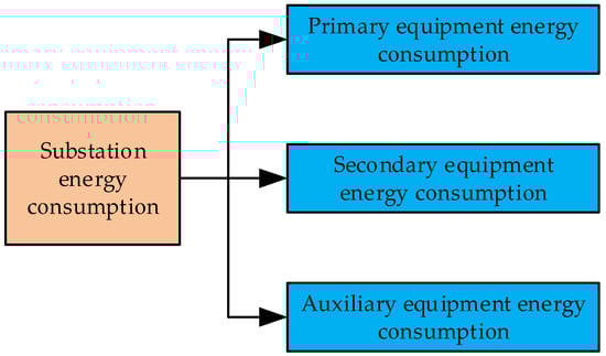 Energy-efficiency indicators include annual power supply, average equipment load factor, and annual energy consumption, of which the annual power supply and average equipment load factor reflect the power supply capacity of the substation, but also the premise of ensuring the profitability of power supply. Substation energy consumption can represent the energy efficiency level of the substation; substation energy consumption mainly comes from the substation’s primary equipment [19], and the substation-energy-consumption-specific composition is shown in Figure 2.
