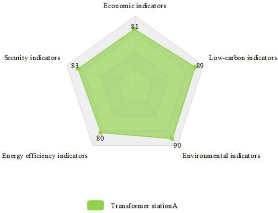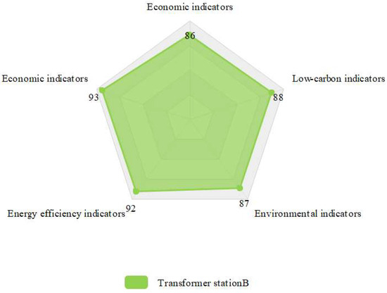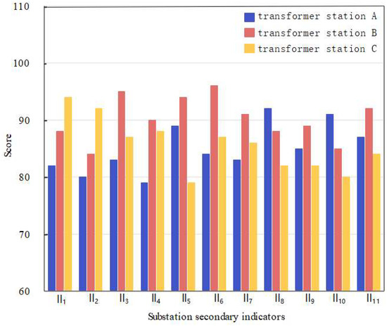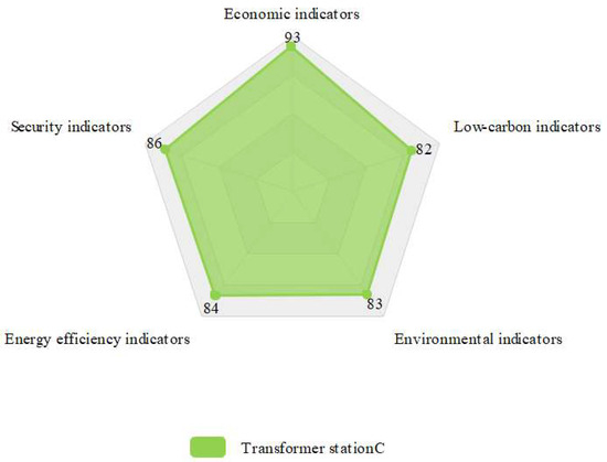 The TOPSIS calculation method was used to obtain the resulting scores for the 11 secondary indicators for the three substations, as shown in Figure 5. The highest scores for annual power supply, average equipment load factor, annual energy consumption, equipment failure rate, average incident handling time, floor space, and carbon emissions were obtained for substation B, with 95, 90, 94, 96, 91, 89, and 92 points, respectively. The highest scores for green area and electromagnetic radiation background value are for substation A, with 91 and 92 points, respectively. The highest score for total life cycle cost and average equipment overhaul cycle is for substation C, with 94 and 92 points, respectively.
