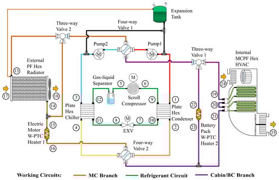 Currently, the global sales of new energy vehicles are booming, of which pure electric vehicles (EV) account for the largest share. However, their limited driving range is one of the critical issues for EV development. As the most energy-consuming part of EVs, the thermal management system needs to consider the passenger thermal compartment [,] and the greenhouse effect of refrigerants [,,,]. Many researchers designed air conditioning systems with a heat pump (HP), from the perspective of system integration with battery cooling (BC) and motor cooling (MC). This can coordinate the heat between the components []. However, the use of different refrigerants can also lead to changes in the performance and system construction of EVs. In this regard, not only is economical high cooling and heating necessary, but refrigerant substitution is also significant.