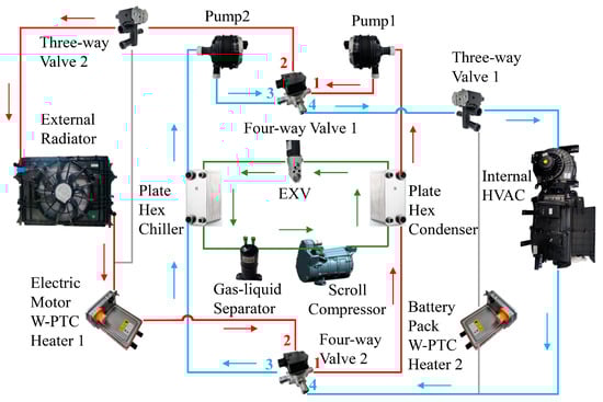 EV HP and integrated thermal management system (ITMS) design has undergone several stages. Traditional air conditioning with a positive temperature coefficient (PTC) electric heating system has the advantage of being highly reliable for low-temperature heating. However, first-generation ITMSs are usually equipped with PTC systems, which are highly inefficient in terms of energy utilization []. Using PTC systems all the time instead of heat pumps severely limits the range of electric cars []; therefore, they cannot be directly applied to EVs. For this reason, various electric vehicle thermal management systems (EVTMSs) have been designed [,]. The principles are based on switching the valve on the refrigerant or coolant water circuit to achieve heating or cooling. Tian et al. [] carried out system performance tests in the environment chamber with variations of refrigerant charge, electronic expansion valve (EXV) opening, compressor speed, environmental temperature, and waste heat amount. Results showed that the optimal charge of R134a is 810 g, and the optimal EXV opening ranges from 70% to 90%.