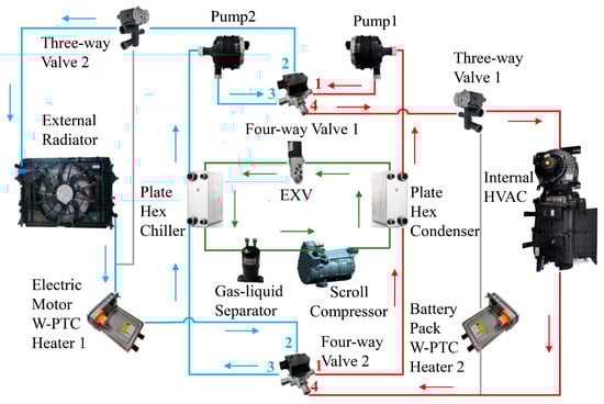 - Tian, Z.; Gu, B.; Gao, W.; Zhang, Y. Performance evaluation of an electric vehicle thermal management system with waste heat recovery. Appl. Therm. Eng. 2020, 169, 11. [Google Scholar] [CrossRef]