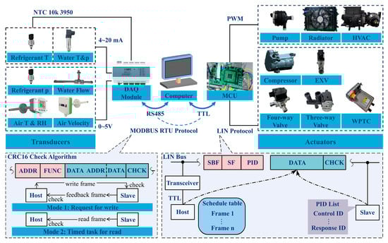 The instruments used in this experiment can be categorized as transducers and actuators. On the transducer side, each outputs a signal as an analog value, and DAQ modules are applied to acquire data. On the side of the actuator, the rotation speed of the electric centrifugal water pump, radiator fan, and HVAC fan are driven by the control signal with pulse width modulation. In contrast, the rotation speed of the scroll compressor, EXV opening, state of the four-way valve, state of the three-way valve, and heating power of the W-PTC are driven through a local interconnected network (LIN) bus.