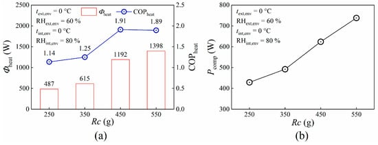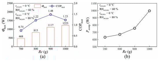 Figure 6a and Figure 7a show the results of heat transfer rate (Φheat) and heating COP (COPheat) with different Rc. It can be seen that there is a slight difference in the parameters around the R290 charge range of 450 g, and a slight difference in the parameters around the R134a charge near 900 g. The COP of the R290 varies from 1.14 to 1.91 and reaches its maximum at its Rc of 450 g. The COP of the R134a varies from 0.74 to 1.48 and reaches its maximum at its Rc of 900 g. Meanwhile, the Φheat keeps rising as Rc increases, but the growth decreases. And Figure 6b and Figure 7b show that the compressor electric power (Pcomp) keeps increasing as Rc increases; thus, the COPheat cannot increase anymore when Rc exceeds a certain value.