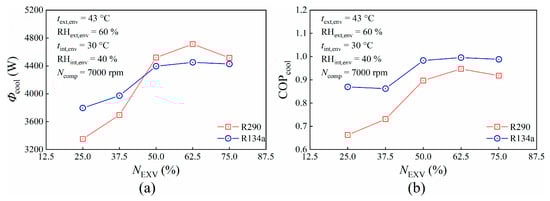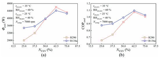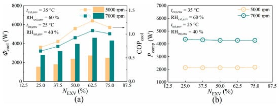 EXV opening and compressor speed results for AC mode at 35 °C of R290: (a) Φcool and COPcool, (b) Pcomp.
