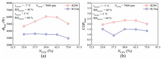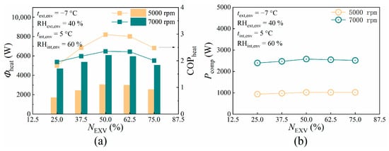 EXV opening and compressor speed results for HP mode at −7 °C of R290: (a) Φheat and COPheaet, (b) Pcomp.