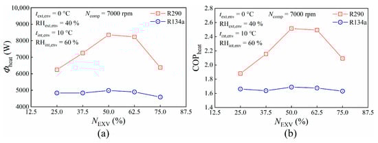 3.2. R290 Performance Analysis with EXV Opening and Compressor Speed