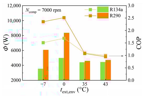 The reason can be explained as follows: when the Rc is too small, the lubricating oil recirculating in the pipes is blocked, and the compressor mechanical efficiency is low; thus, the compressor electrical power cannot be efficiently transferred into refrigerant, and the Φheat is low. With an increase in Rc, the mass flow rate of refrigerant is increased, so the Φheat keeps increasing, and the compressor electric power (Pcomp) increases also. After Rc exceeds the optimal charge, increasing Rc would lead to elevated compressor power, higher friction loss, and reduced isentropic efficiency. At the same time, too high a mass transfer rate would lead to fluid accumulation, which causes heat accumulation in the plate heat exchanger. Both of these reasons are reflected in the decline in COPheat and the narrowing of the growth of the heat transfer rate. Moreover, since R134a has a lower heating capacity than R290, it is easier to have a situation of COPheat < 1.