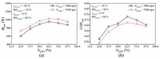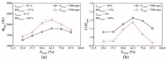 Under the external environment temperature (text,env) of 35 °C, the optimum opening for the ITMS is 62.5%. Relative to the NEXV of 25%, the cooling capacity can be increased from 1546 W to 2732 W at the Ncomp of 5000 rpm, which means 76.7% growth, while the growth rate of COP is up to 77.7%, with the value ranging from 0.72 to 1.28. And the cooling capacity can be increased from 2804 W to 4600 W at the Ncomp of 7000 rpm, which corresponds to 64% growth; meanwhile, the growth rate of COP is 67.2%, with the value ranging from 0.64 to 1.07.