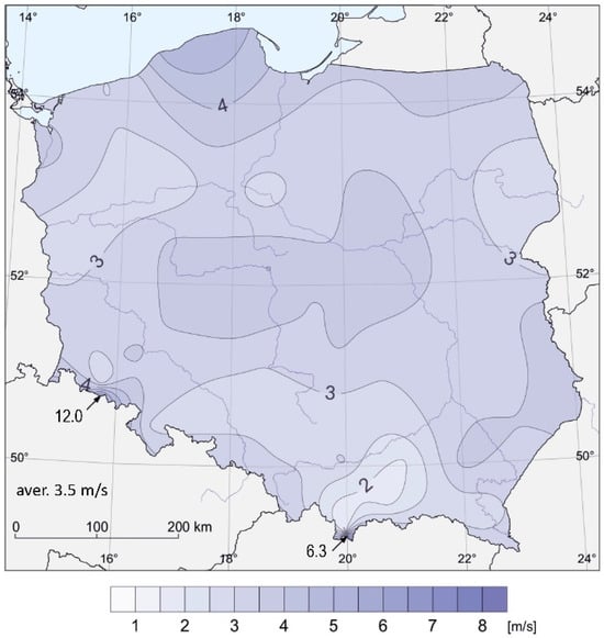 Mean wind speed at 10 m above sea level in open terrain in Poland (based on ref. [15]).
