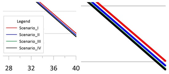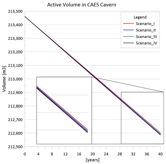 In the case of the CAES cavern (Figure 4 and Figure 5), it is clearly visible that the smallest loss of volume occurs in the case of scenario I. It follows that the daily operation of the storage is, in this respect, the most advantageous for this type of cavern. In the other scenarios, we are dealing with slightly larger losses of active volume over 40 years of storage operation (in these three variants, the losses are similar). However, it should be clearly noted that the differences between the most and least advantageous variants do not exceed 20 m3.